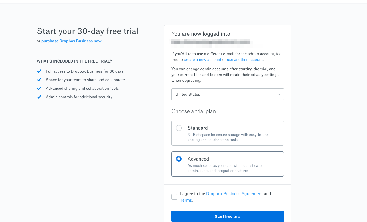 First up on the list - Dropbox still offers a free plan with no trial period for individuals, however, if you'd like to try the business plan, you need to start a 30-day trial.